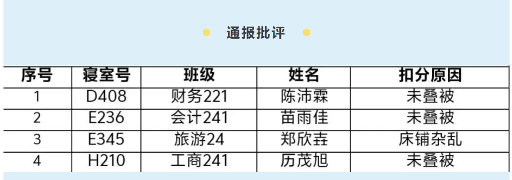 希望大家向优秀寝室、通报表扬同学学习。宿舍是一个温馨的港湾,它的整洁干净离不开大家共同的努力,让我们一起努力创造一个有序、卫生的生活环境。